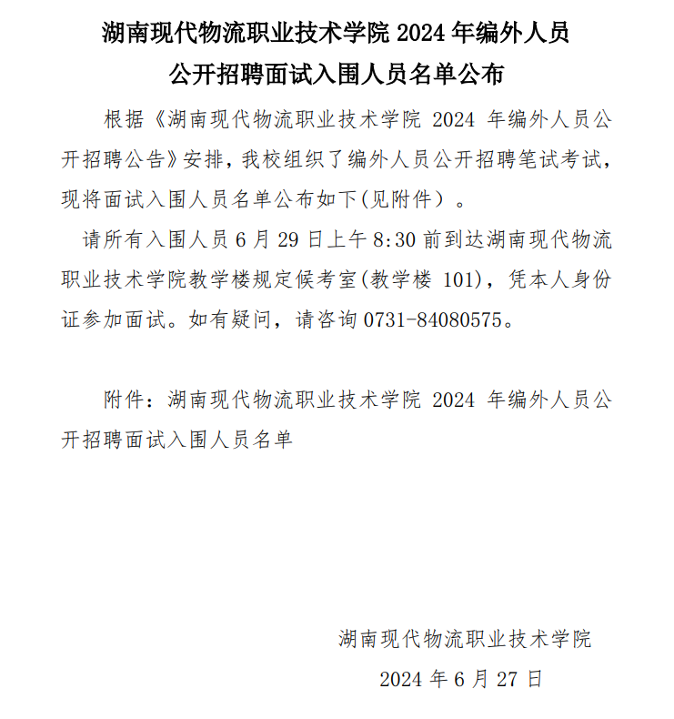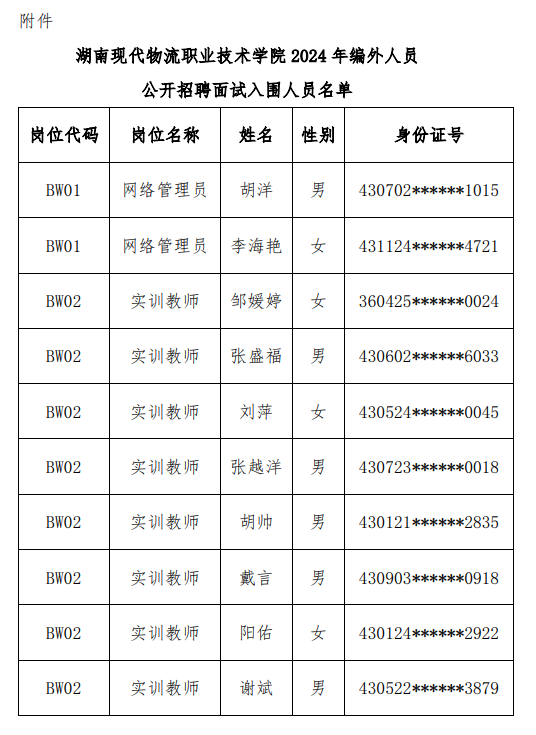湖南现代物流职业技术学院2024年编外人员公开招聘面试入围人员名单公布